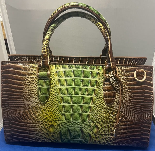 Fiore Handbag in green and brown 12" wide x7" long. additional crossbody strap