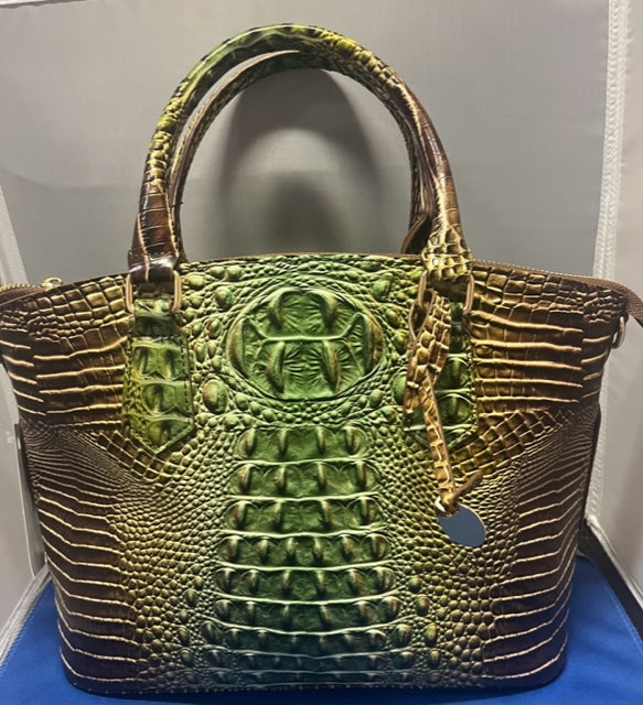 Fiore Handbag in green and brown 13" wide x 10" tall additional cross body strap zip closure with a center zip compartment