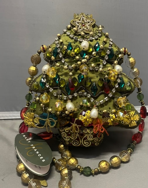 MARY FRANCES HANDBAG HAND BEADED IN THE SHAPE OF A CHRISTMAS TREE NAMED GOOD TIDINGS 9" TALL 6" WIDE WITH BEADED HANDLE