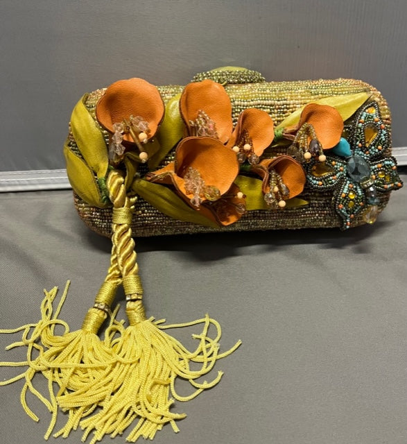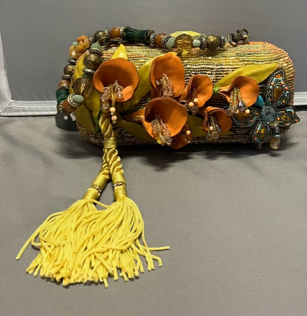 MARY FRANCES HANDBAG CALLED WATER LILY HAND BEADED original price $250.00 now $195.00 new with tags 7" wide 4" tall removable beaded handle 12" long